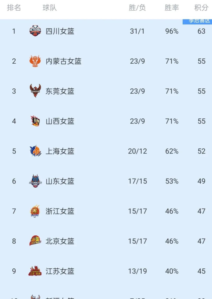今年的四川女篮可以说格外的优秀,在常规赛中仅仅输掉了一场比赛。而与之相对比的是福建女篮整个常规赛仅仅赢得了赢得了一场比赛,但哪怕就赢得了一场比赛的胜利也能够顺利的进入到季后赛,不得不说这还是非常有意思的。当然天津女篮甚至一场比赛都没有赢。